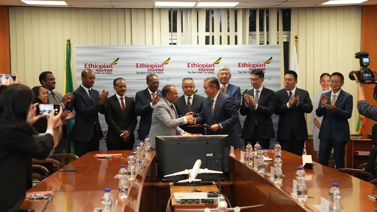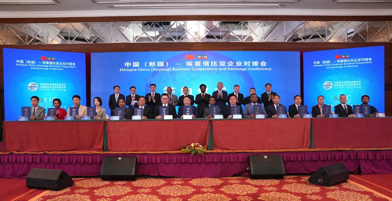 2025年5月13日,中国(新疆)—埃塞俄比亚企业对接会在亚的斯亚贝巴举行,正在埃塞访问的新疆维吾尔自治区主席艾尔肯·吐尼亚孜、驻埃塞俄比亚大使陈海、使馆刘晓光公参、埃塞外交部国务部长哈德拉、工业部国务部长特雷肯、投资委主任泽莱克以及在埃塞中资企业、埃塞商协会和企业等近200人参加。