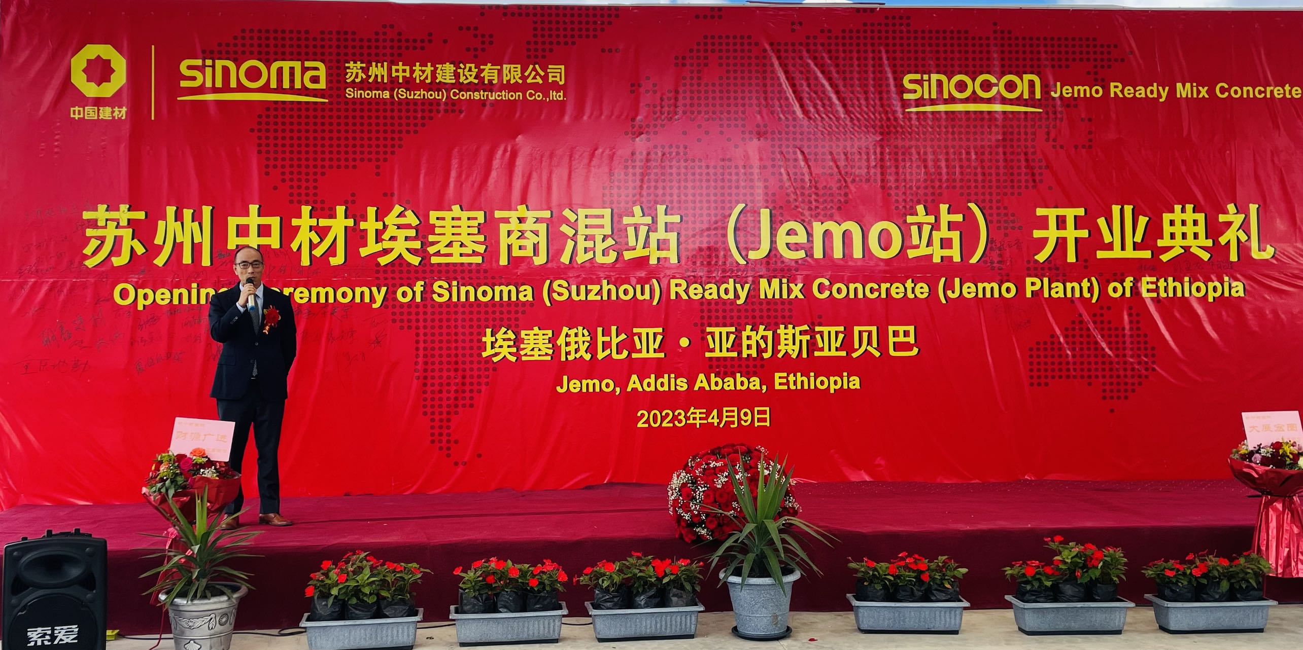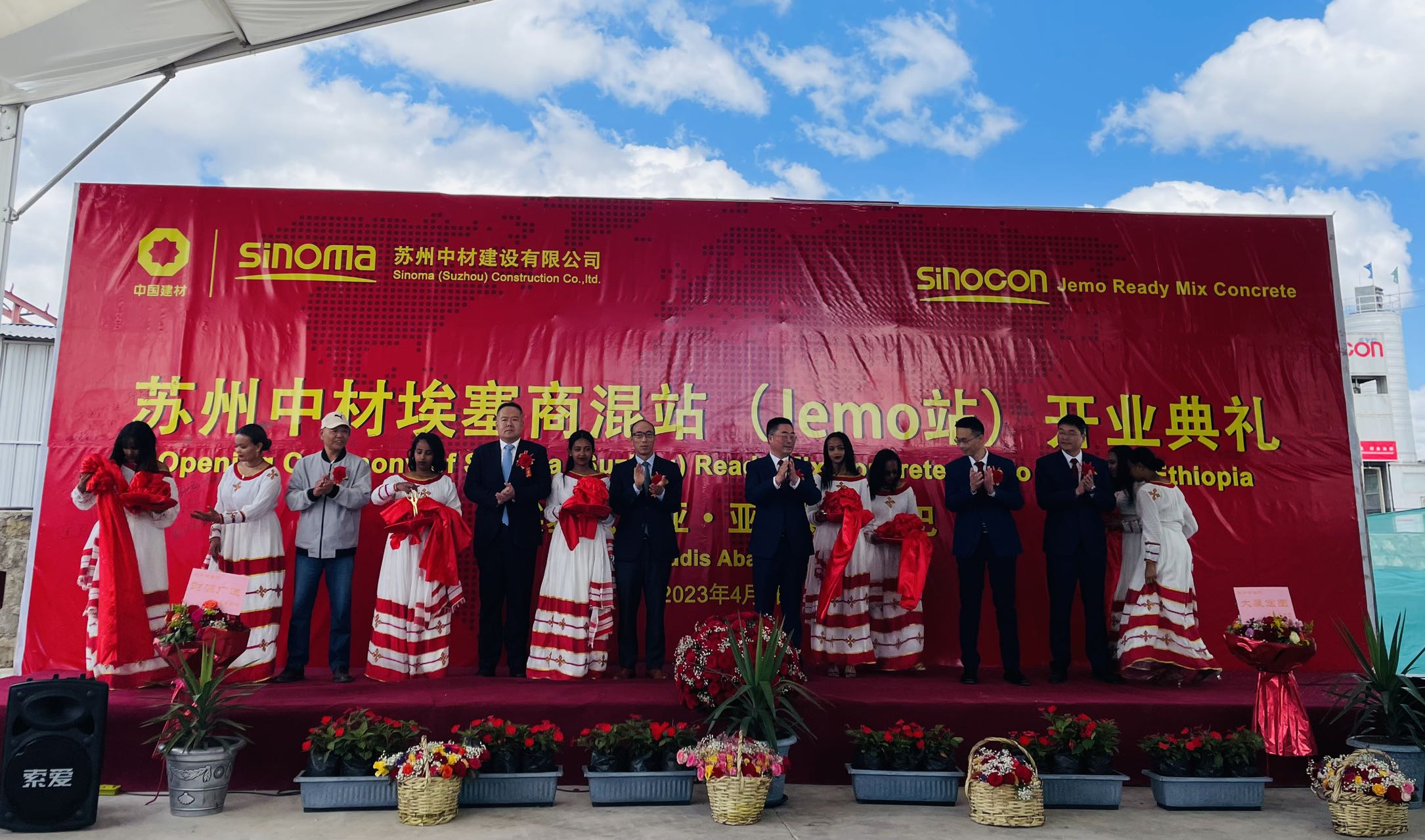 2023年4月9日,驻埃塞俄比亚使馆公使衔经济商务参赞杨依杭参加苏州中材埃塞JEMO商混站开业典礼并致辞。苏州中材、中材国际负责人,埃塞中国商会及在埃中资企业代表出席。